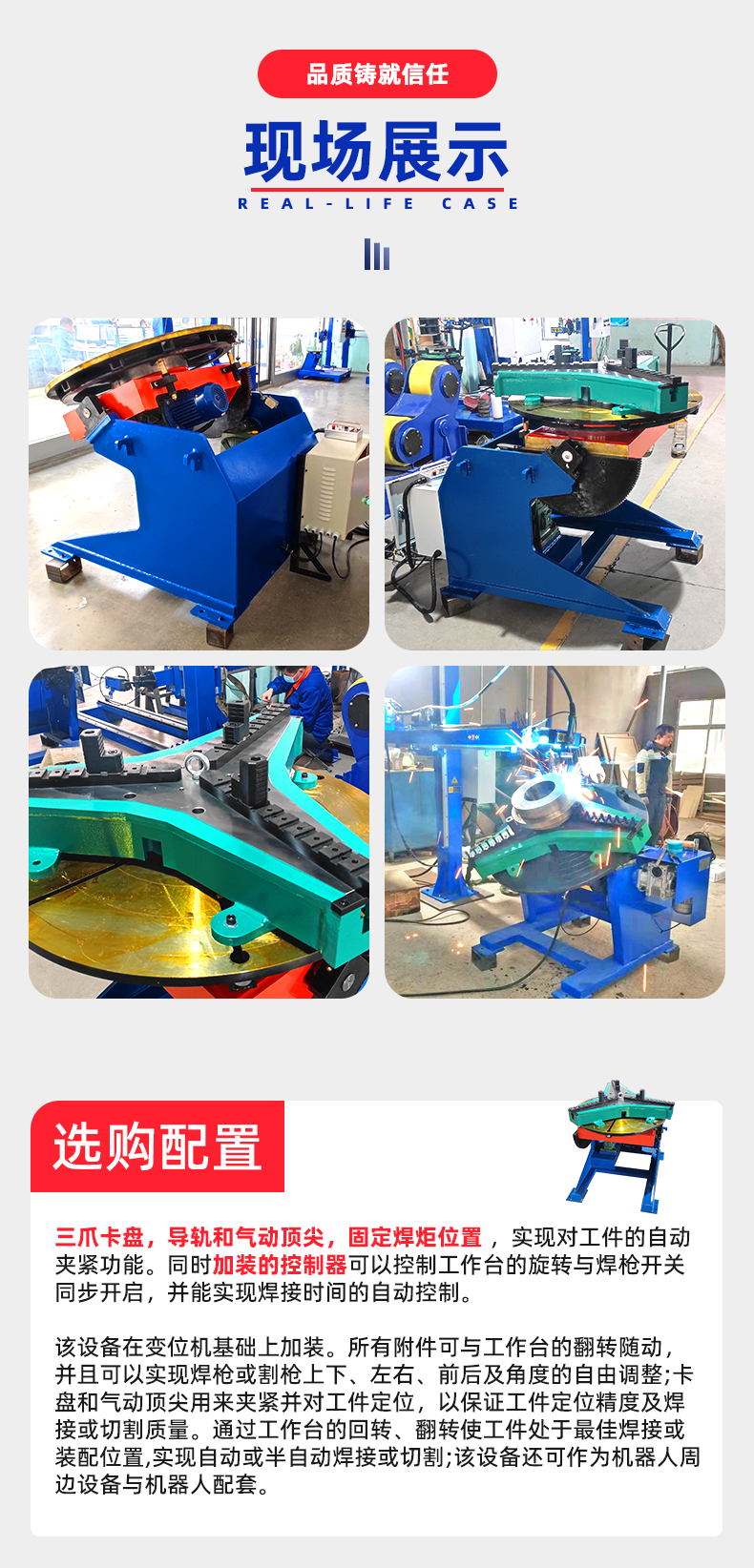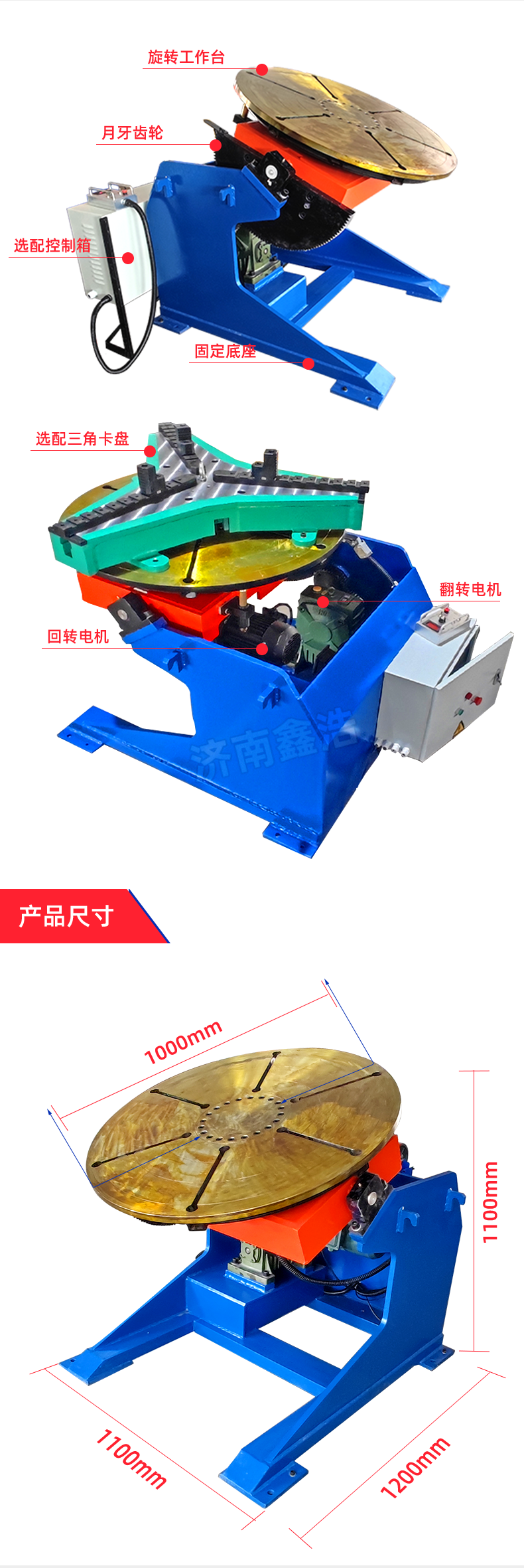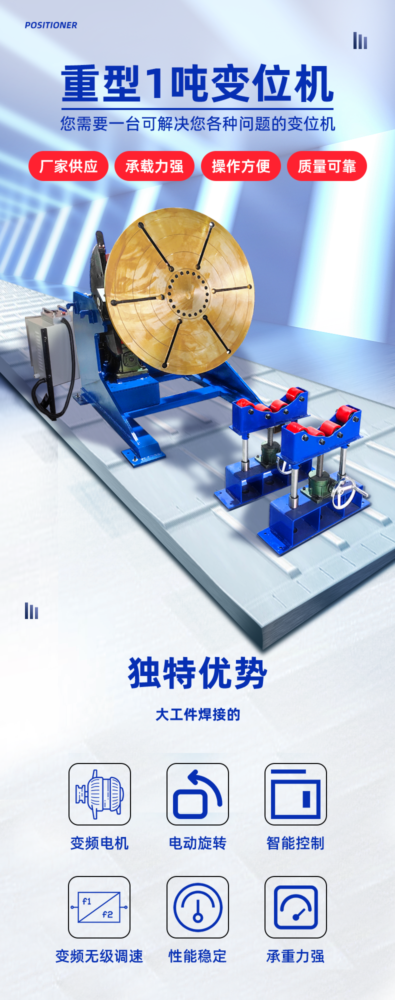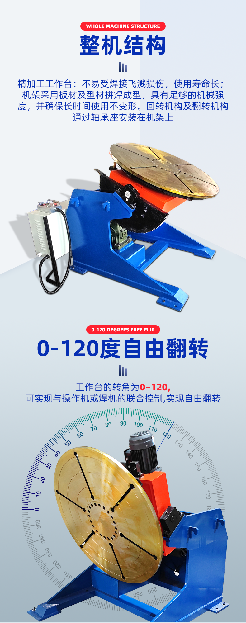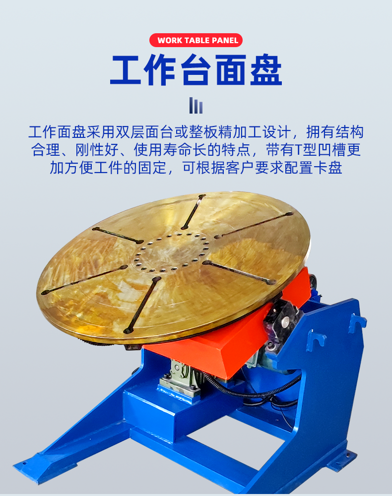 鑫浩1噸重型變位機,實(shí)現卡盤(pán)快速加緊,電動(dòng)傾斜工作臺一個(gè)角度是焊縫除于一個(gè)平焊狀態(tài),